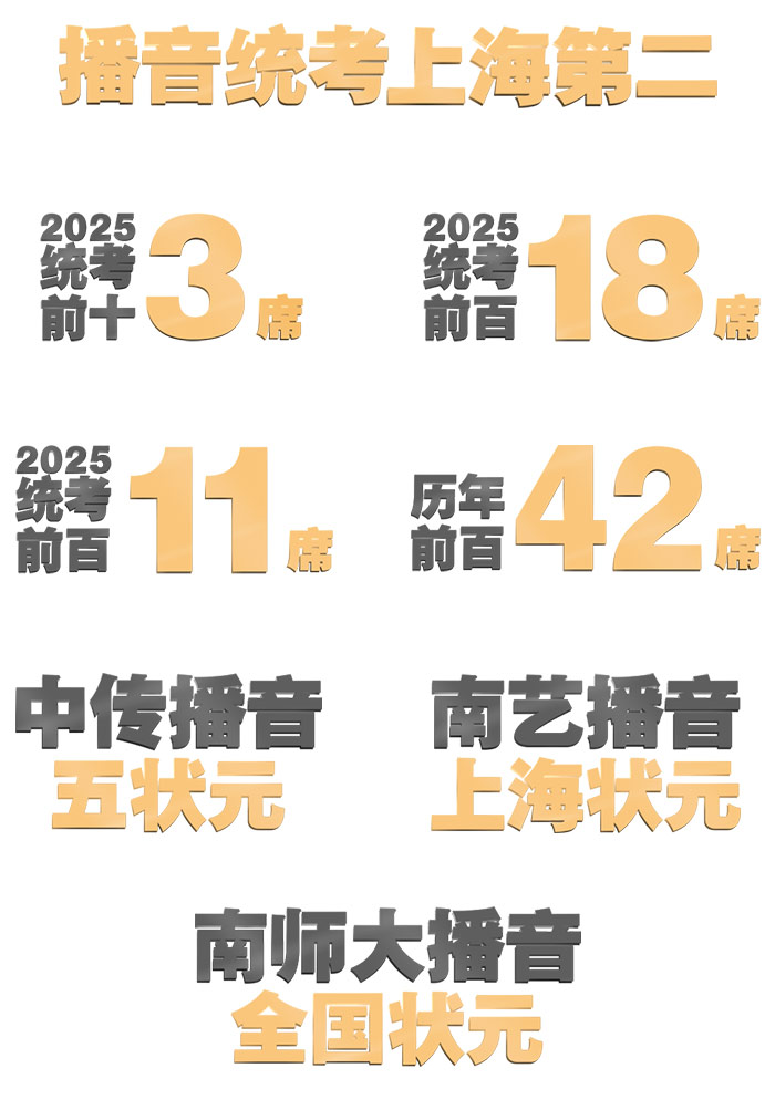 印象集團的播音專業蜚聲國內藝考屆,僅浙江省統考就已蟬聯八次冠軍!上海印象教育坐擁上海戲劇學院師資力量,依托總部完善的教學體系和優質的教研資源,持續刷新成績高度。